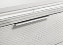 Maximize your bedroom storage with this stylish 5-drawer chest, featuring a modern Italian design. The white finish and picture framed recessed panels with embossed herringbone graphic patterns create a sophisticated look. Accented with mirror framing, acrylic legs, and polished chrome metal hardware, this chest offers ample storage space. Crafted from Asian hardwood, MDF, and mirror, this chest combines style and practicality, making it a perfect addition to your luxurious bedroom.