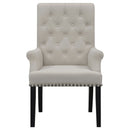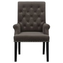 Bring together family and friends at this modern rustic style dining table set. The table features a rectangular, thick, white marble top that is spacious enough for six people. Sleek open and airy trestle base with a center punch out, rustic espresso striking color combination lends a dramatic touch and grounds the room elegantly. The set of chairs with a rolled backrest with button-tufted details lends a traditional aesthetic to a space. Also, bringing to your home the classic elements is a padded seat with individual nailhead trim that offers a charming detail.