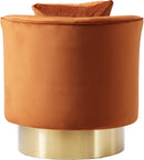 All eyes will be on this grand piece when you complement your living room with this bold cognac velvet Kendra accent chair. Upholstered in stunning rich cognac-colored velvet, this contemporary chair's round design is not only boldly fashionable, but provides you with the utmost comfort while you sit. A gold swivel base complements its gallant color, while also making it easy for you to turn this way and that while seated.