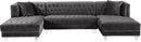 Grab a friend and get comfortable on this beautiful Moda grey velvet three-piece sectional sofa. This astounding sectional epitomizes luxurious living and features lots of room for the whole gang to get comfortable. Double chaise lounges on each end gives you space for stretching out for a quick cat nap, while deep tufting adds to the luxurious appeal of this unit. Acrylic lucite legs and a sturdy frame make this sectional a durable addition to your living room or den, while the included pillows give a homey slant to an otherwise uber contemporary sectional.