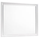 Exceptionally designed for transitional bedrooms, this five-piece bedroom set includes a panel bed frame, single two-drawer nightstand, five-drawer chest, and seven-drawer dresser with mirror, all in a crisp white finish with shiny metal hardware with faceted crystal accents. The paneled headboard and footboard offer channel tufted paneling wrapped in a metallic leatherette upholstery. Other extra touches include frame molding, turned feet, and felt lined top drawers. The nightstand offers a convenient power outlet for charging devices before bed. Place this bedroom set in a home to lend a more glamorous vibe.