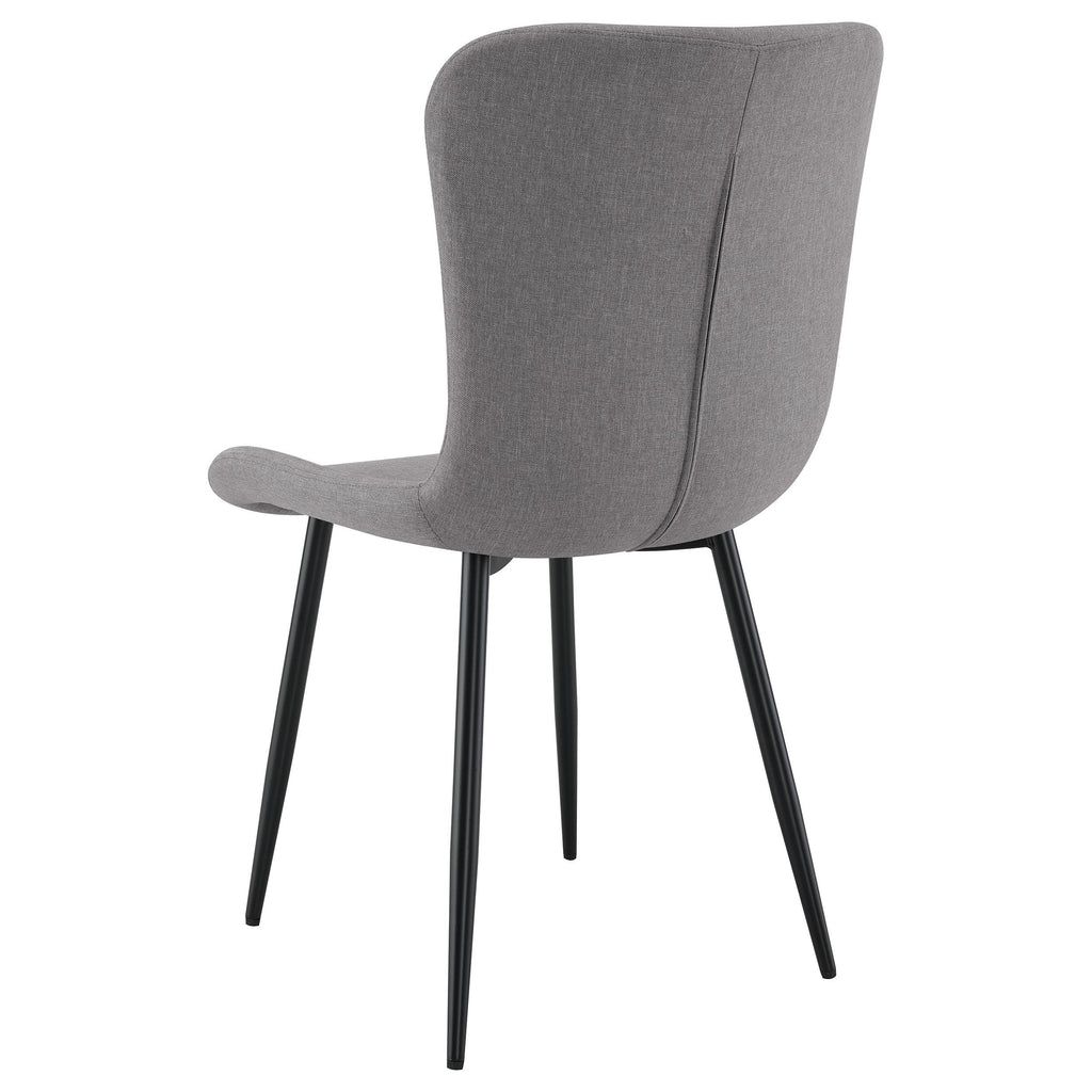 This dining chair combines sleek modern design with practical comfort. Upholstered in a grey linen-like fabric, the seat and backrest are crafted for easy care and long-lasting use. The contoured design offers ergonomic support, while the foam-padded seat ensures comfort during meals. Sturdy black powder-coated metal legs provide a minimalist aesthetic with dependable durability. Constructed from plywood, foam, fabric, and metal, this chair is a versatile and stylish addition to any dining space.